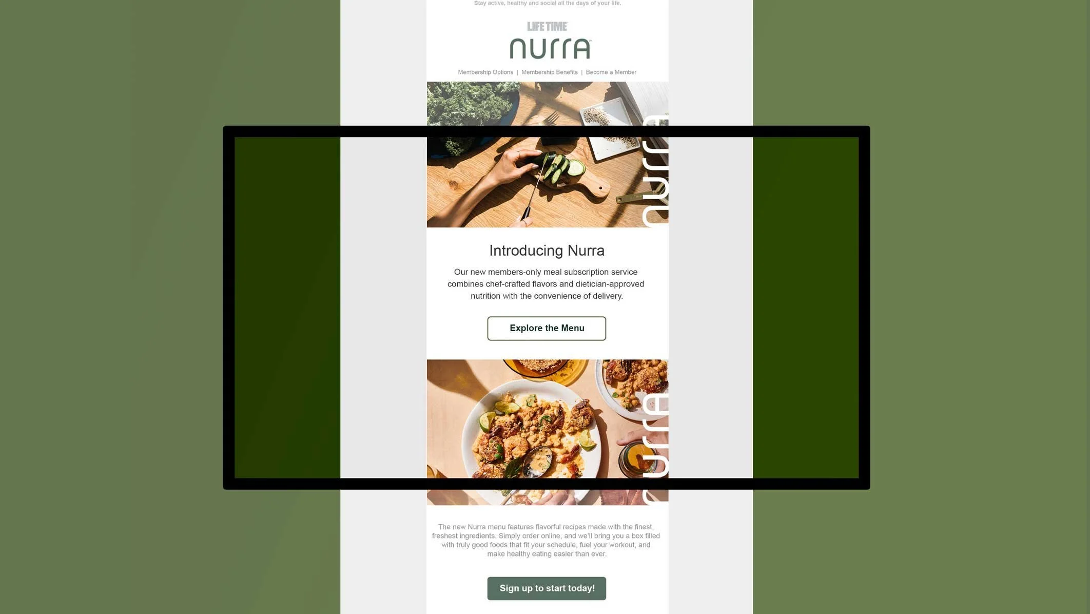 Nurra is Life Time’s meal delivery service. I helped launch this new sub-brand and supported all copywriting, from web content to social content, video content, print and more.